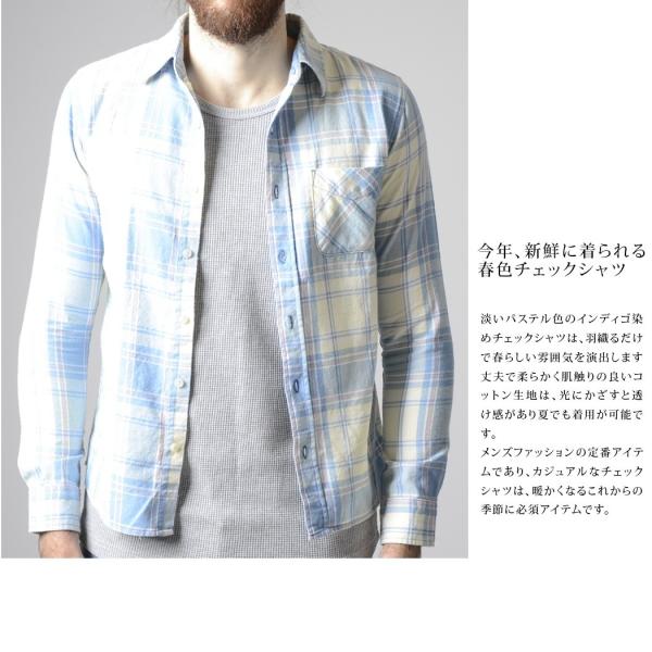 インディゴチェックシャツ メンズ ネルシャツ デニムシャツ 長袖シャツ 腰巻 サーフ系 イエロー ブルー パステルカラー 40代 30代ファッション 未使用品 春服